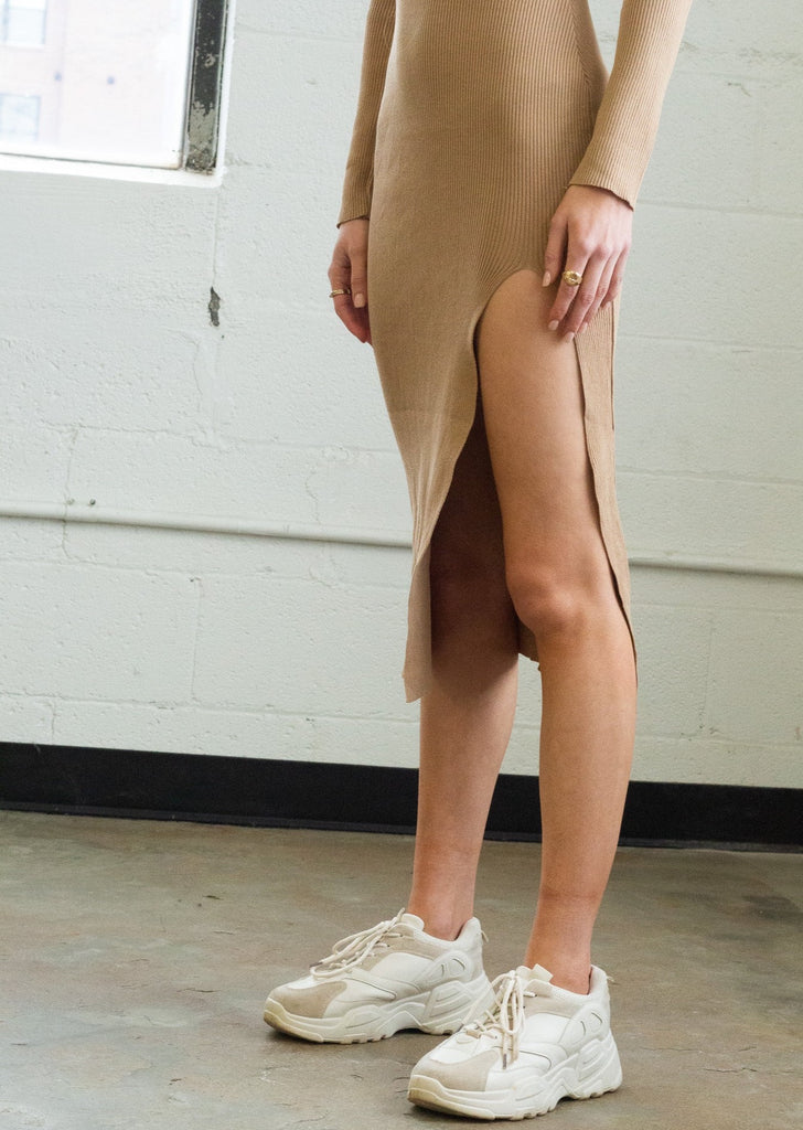 Soft ribbed knit v-neck long sleeve ribbed dress with high side slit.